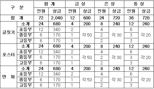 - 심사결과에 따라 분야별 입상인원이 변동될 수 있으며, 기존 공모전에 출품된 작품과 유사한 내용의 작품은 입상에서 제외 또는 취소됨